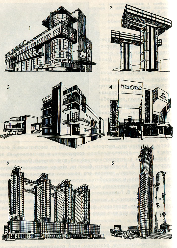 1, 2, 3 — Каркасно-блочная система индустриального домостроения. Архитектор. Н. А. Ладовский, 1931 г.;