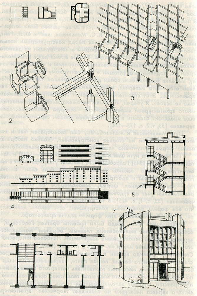 4, 5, 6 — Проект строительства жилых домов по системе «Тахитектон», 1931 г., Ленинград. Архитекторекторы И. В. Рянгин, С. Н. Перн. Схема строительства, разрез и план; 7 — дом-контейнер, 1927—1929 гг., архитектор. К. С. Мельников