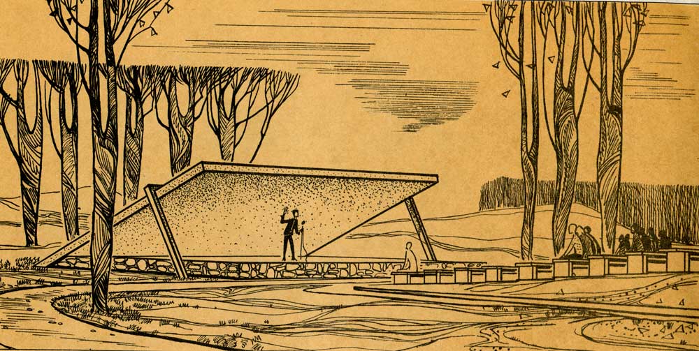 Подобные эстрады сооружают в городских садах, лесо- и лугопарках.
