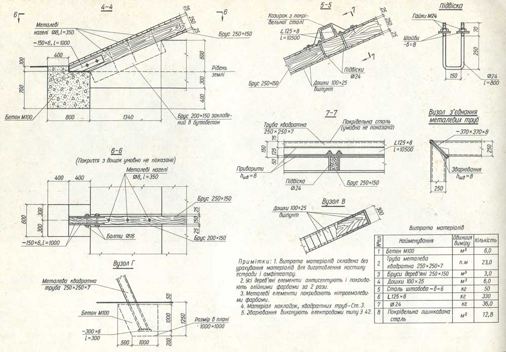Материалы, из которых сооружена эстрада, оставляют естественного цвета и фактуры. Древесину пропитывают горячей олифой, а сиденья дополнительно покрываю бесцветным лаком.