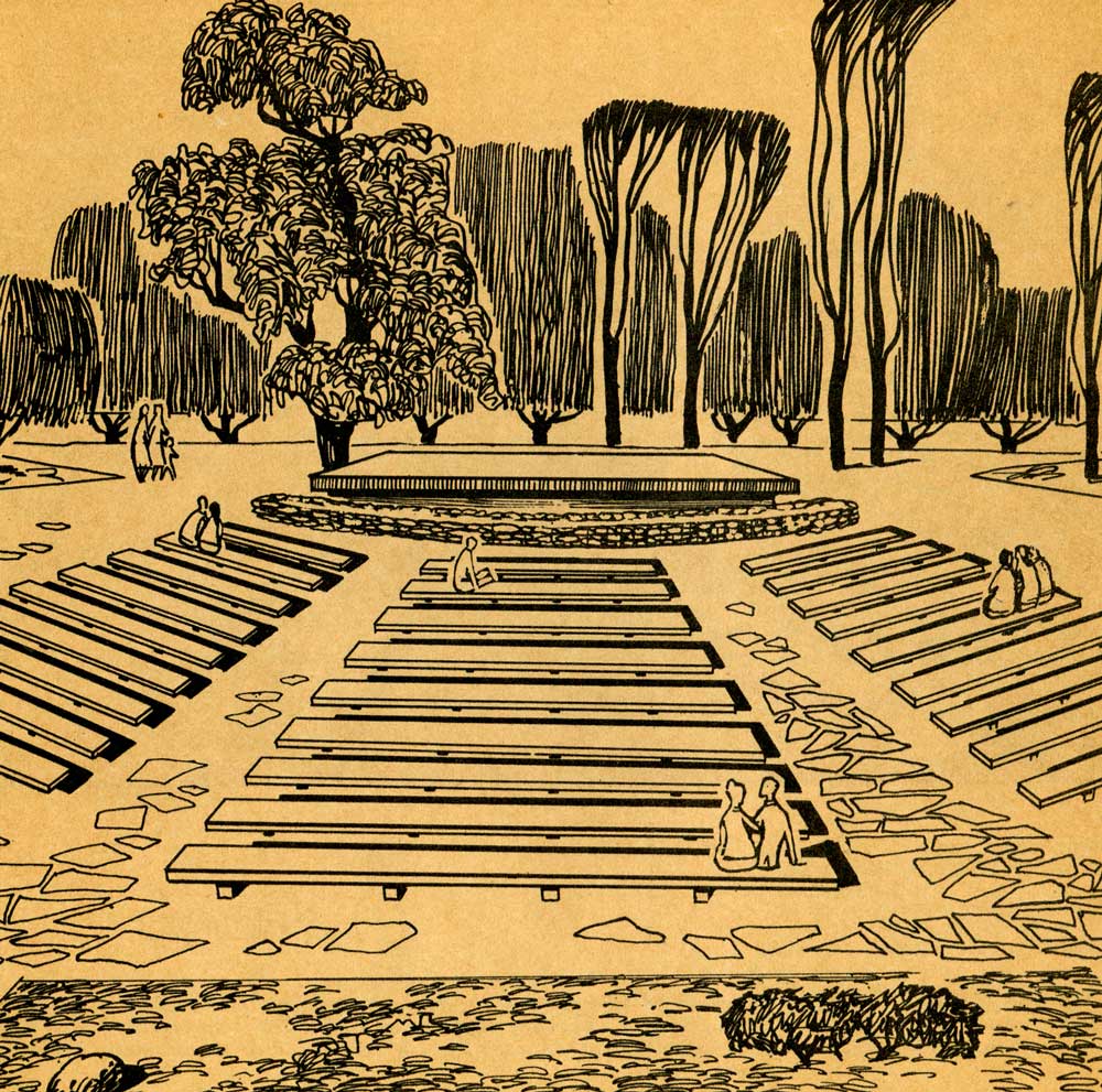 Летняя эстрада, рассчитанная на 750 зрителей, состоит из трех основных элементов — сцены, оркестровой ямы и секторов для зрителей. Для сооружения такой эстрады выбирают местность с естественным уклоном. Желательно, чтобы за сценой была плотная кулиса из высоких деревьев.