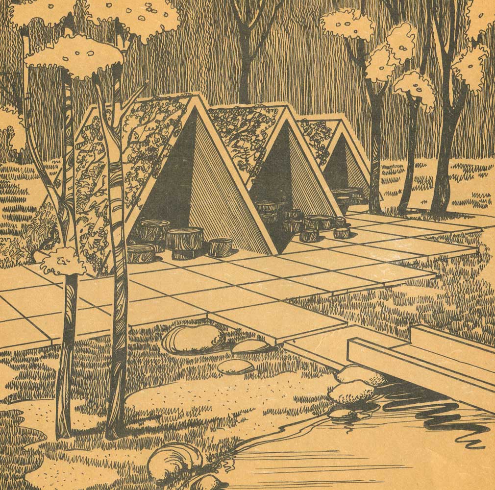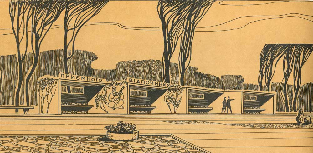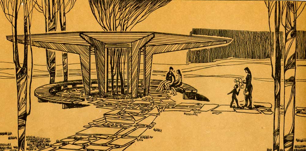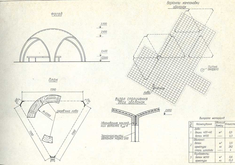 Павильон для отдыха. В плане он имеет шестигранную форму и представляет собой оригинальное сооружение. Покрытие опирается на шесть Г-образных опор. Основной строительный материал — дерево и металлические трубы. Площадка под навесом и подходы к нему замощены плитами. Такие павильоны сооружают в парках, садах, больших скверах, дворах.