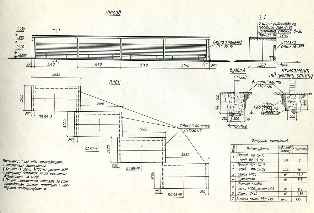 Четыре павильона составлены в один блок со ступенчатой компоновкой в плане. Размещены сооружения на площадке, покрытой плите» ми. Стандартные железобетонные панели можно окрасить или оставит естественного цвета и фактуры. Задние стенки — из кирпича или естественного камня. Деревянные детали скамьи не окрашивают, а пропитывают лаком. Своеобразным украшением для стен павильона буде! вьющаяся зелень.