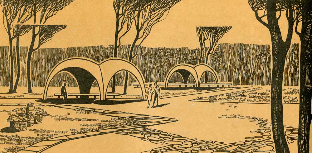 Павильоны шаровой формы из стандартных железобетонных панелей. Плиты мощения заходят внутрь сооружения. Мебель сделана из срезов деревьев и пней. Панели оставляют естественного цвета. Уместным украшением здесь будет вьющаяся зелень.