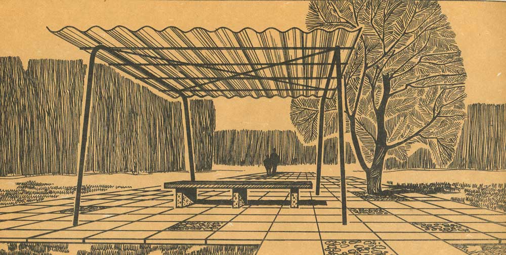 Теневой навес. Покрытие — из асбестоцементных листов или пластика. Опоры — рамы из металлических труб. Все металлические конструкции следует окрашивать в темный цвет. Хорошо также смотрится сочетание красного и желтого цветов. Под навесом установлена скамья, покрытая яркой краской.