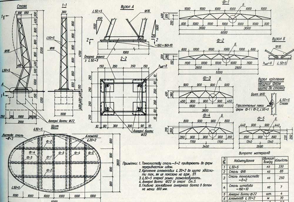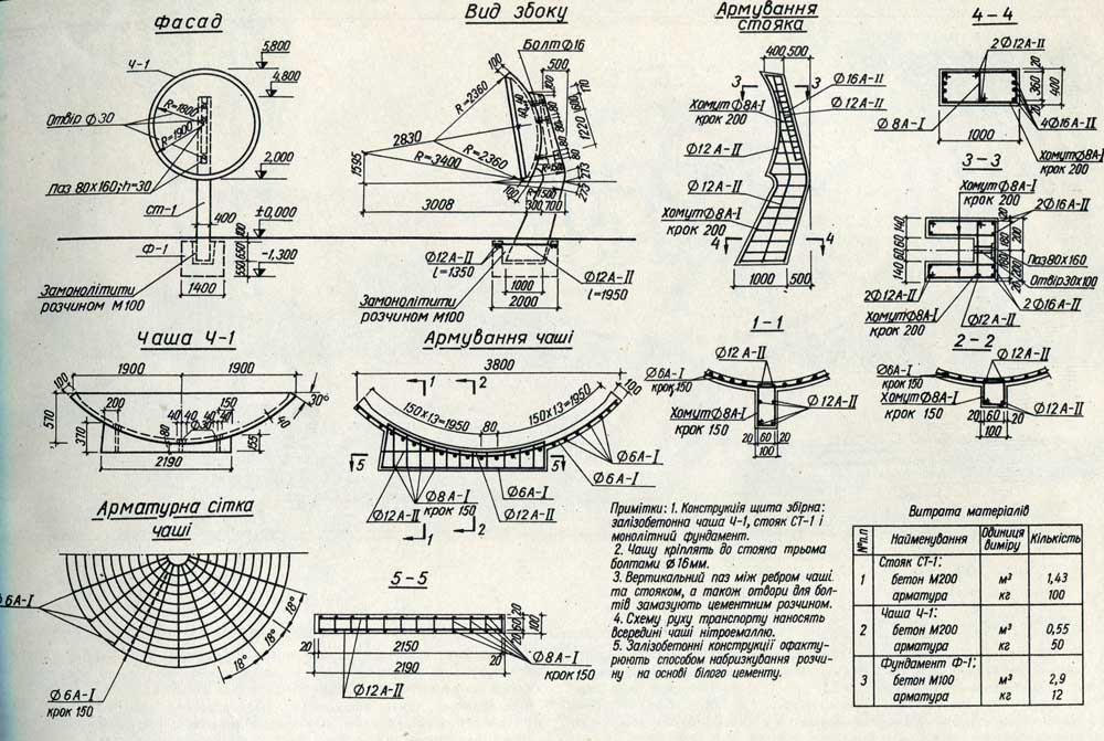Щит-схема проезда через город. Это простая по форме, выразительная объемно-пространственная композиция из железобетона, в которой все подчинено основному элементу — изогнутому овальному экрану.