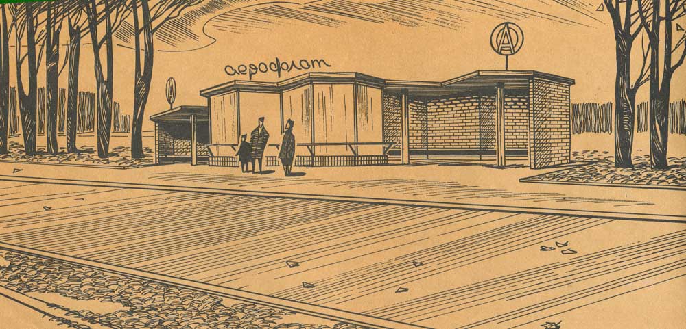 Павильон-остановка грибовидной конструкции, железобетонный. Стены из кирпича. Их можно облицевать керамикой с простым орнаментальным рисунком. Цоколь облицован глазированным «кабанчиком». Надпись «Аэрофлот» и знак «А» установлены над крышей на высоте 80 см. Скамья деревянная. Ее не следует окрашивать. Чтобы улучшить эксплуатационные качества древесины, ее необходимо пропитать олифой и покрыть лаком.