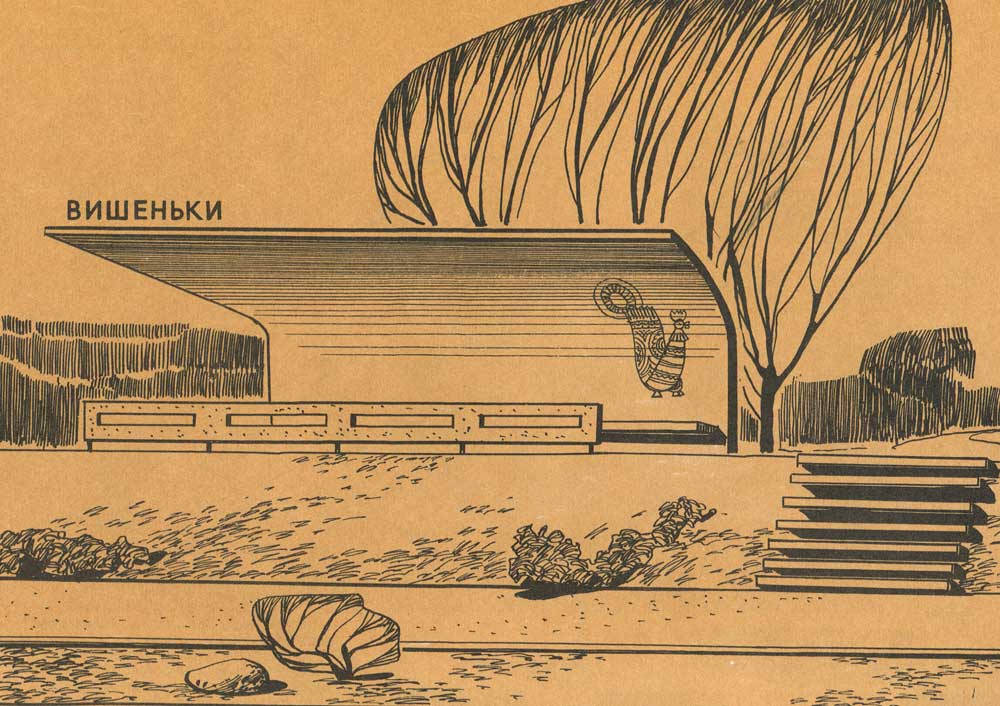 Транспортный павильон-остановка, совмещенный с предприятием общественного питания (кафе, буфетом). Сооружен павильон из шестигранных грибовидных железобетонных конструкций. Обогащает композицию бутовая стена с нишами, в которых размещены разные по форме керамические кувшины с вьющейся зеленью. Удачно сочетаются бут, бетон, дерево и стекло. Следует сохранить естественный цвет этих материалов, не облицовывая и не окрашивая их.