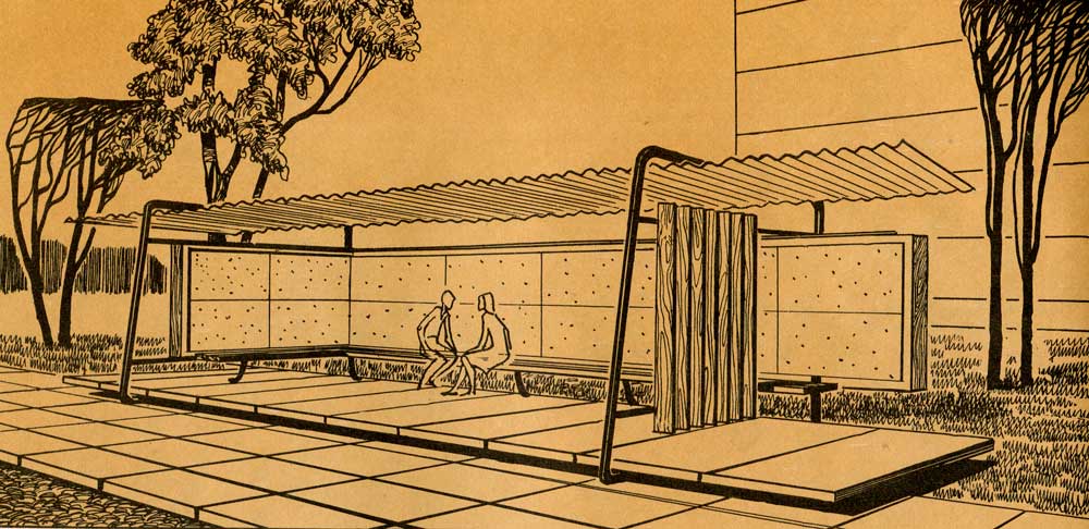 Павильон-остановка. Облегченная конструкция сооружения позволяет в случае необходимости перенести его в другое место. Покрытие из асбестоцементных листов или стеклопластика. В случае применения яркого пластика стойки красят в черный цвет. Серые асбесто-цементные листы приятно сочетаются с красным или оранжевым цветом. Предназначено сооружение для мест остановки транспорта.