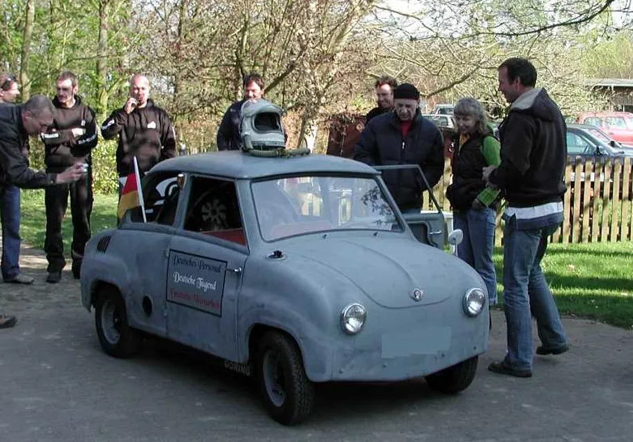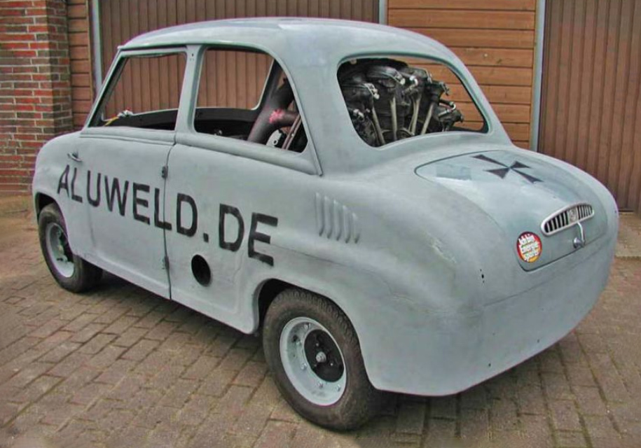 Разумеется, существует множество других проектов с использованием авиационных двигателей, в том числе и турбореактивных. Многие такие машины выступают в дрэг-рейсинге, где в мгновение ока пролетают дистанцию в четверть мили. Но мало какой подобный проект сравнится по безумию с этим Goggomobil, оснащенным 9-цилиндровым российским радиальным авиамотором М14П Ивана Михайловича Веденеева. Форсированный с 360 до 430 сил, двигатель превратил субкомпактный Goggomobil (да, это не Запорожец!) в огнедышащего дракона. m