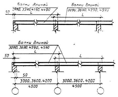 Расположение балок в брусчатых и каркасных зданиях с привязкой наружных стен к координационным осям по схемам а и б