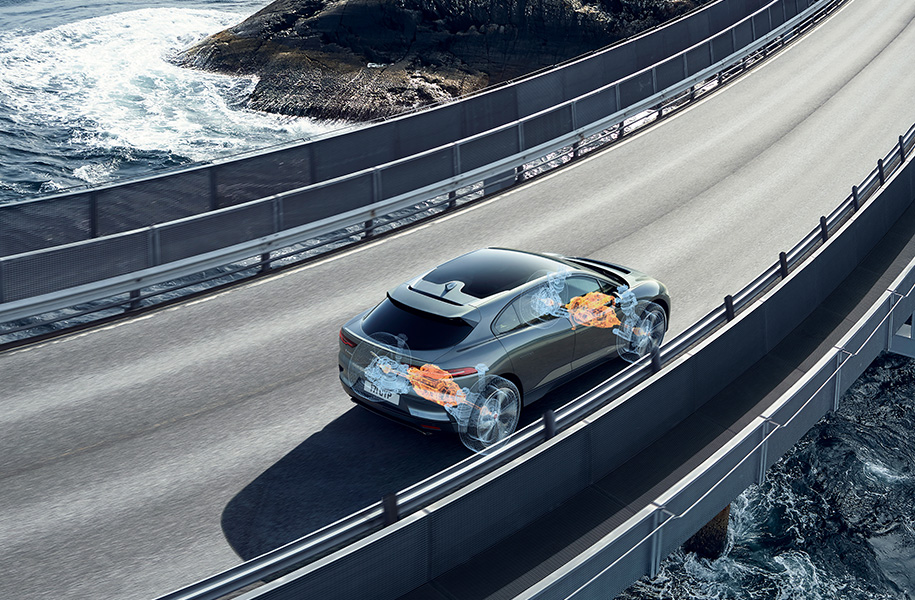 При этом инженеры JLR все же решили сэкономить на разработке и позаимствовали некоторые узлы от серийных моделей. Например, передняя подвеска у I-Pace на двойных поперечных рычагах – как на F-Pace, а задняя – многорычажка с интегральным звеном, знакомая по большинству легковых «Ягуаров». В качестве опции доступны пневмобаллоны (идут в комплекте с адаптивными амортизаторами). И собрано все достаточно просто: подрамники с подвесками крепятся к мощному батарейному блоку, который обладает высокой жесткостью и помогает максимально низко опустить центр масс (тут он на 13 см ниже, чем у F-Pace).
