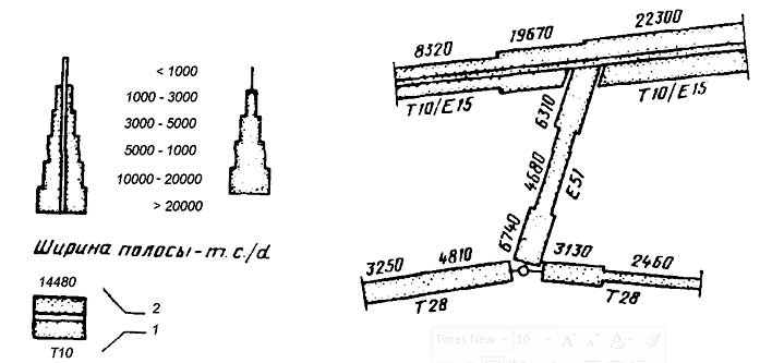 4.3. На основе плана пунктов учета (см. черт. 1) следует подготовить эпюру интенсивности движения. На эпюре (черт. 3) представляют среднегодовую суточную интенсивность движения (количество транспортных средств в сутки) в виде диаграммы и плана интенсивности.