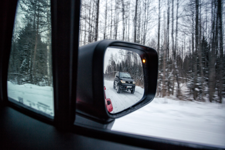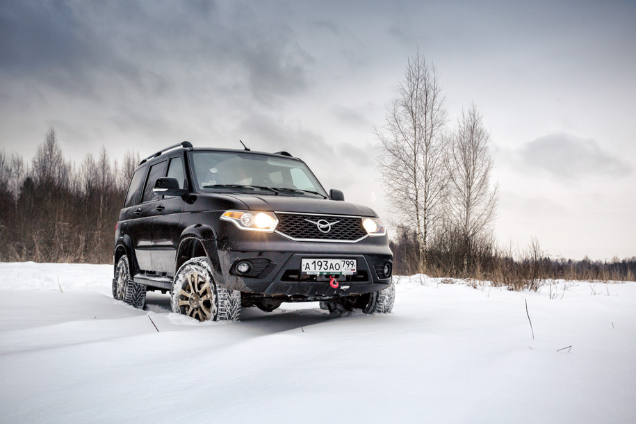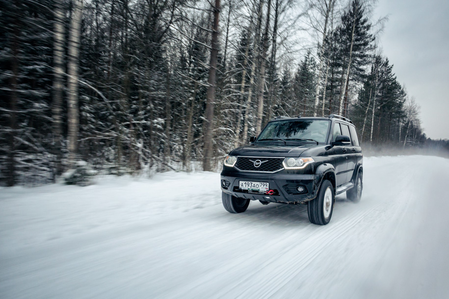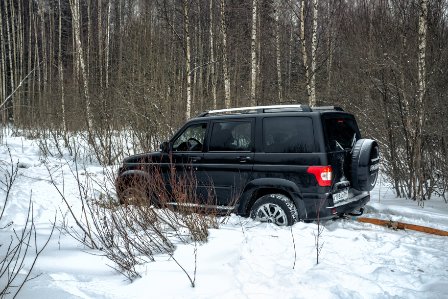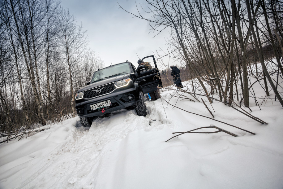 Я не знаю места, где еще лучше можно было бы раскрыть внедорожный потенциал «Патриота». Жестко подключенная морда, понижайка, блокировка заднего диффа. Со всем этим хозяйством УАЗ великолепно чувствует себя в целине, где глубина снега иногда доходит до ступицы.