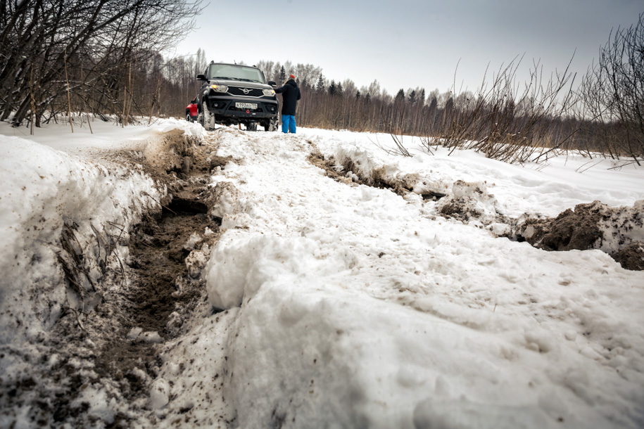УАЗ трогается с места, проезжает пару десятков сантиметров… Удар, еще удар – и машина замирает без движения, будто на нее свалилась бетонная плита. Лед под колесами тяжеленного внедорожника проломился, а под этим льдом оказалась зияющая грязевая бездна, но проблема была не в ней, а в безалаберности днища «Патриота». Он окопался передним редуктором и прекратил движение, хотя какой-никакой зацеп на задних колесах был, а от земли до бамперов оставалось несколько сантиметров.