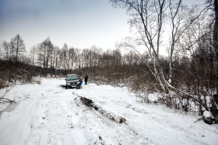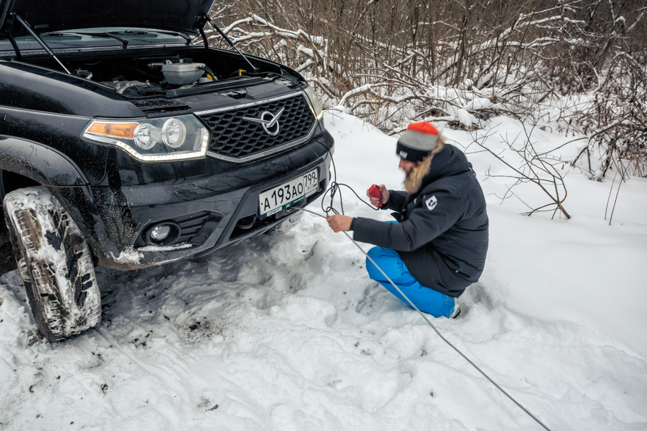 Пробуем еще раз УАЗом, но аккуратненько, по кромке колеи. Первое проблемное место осталось позади, но на дорожных шинах «Патриот» опять стаскивает, и он снова пробивает лед, повиснув на бедняге-редукторе. Снова трос, снова «Джип» и пара отчаянных рывков, которые вынимают УАЗ из плена.