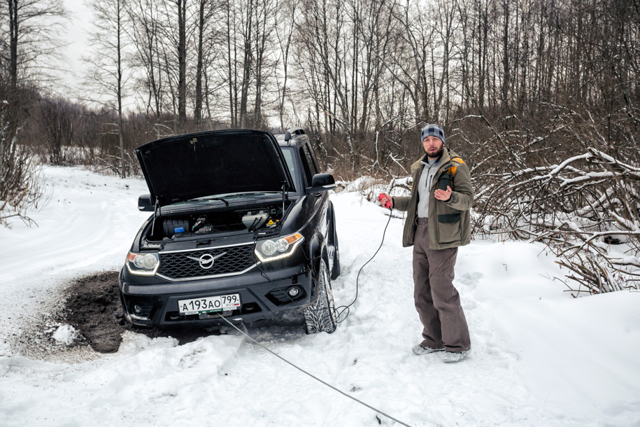 Деревья вокруг хлипенькие, лебедиться на за что. Без особой веры в успех, но с надеждой цепляем трос к «Джипу», который на семь центнеров легче «Патриота» и, по паспорту, не должен таскать за собой ничего тяжелее 900 килограммов. Но! Рывок, еще рывок – и «Патриот» все-таки срывается с места. Зря мы не верили.
