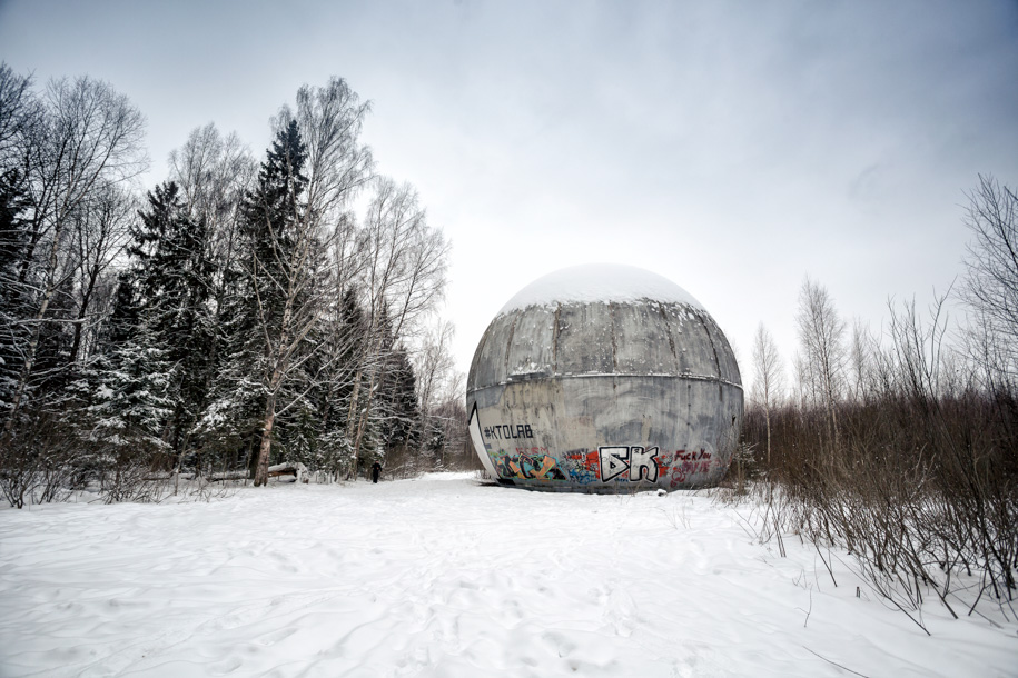 Говорят, что раньше вокруг этой сферы высотой с пятиэтажку хотели построить санаторий, но эти планы умерли вместе с СССР. Пойди история другим путем, внутри купола сделали бы кабинеты для принятия грязевых ванн и электрофореза, а курортники с застиранными полотенцами и санаторными картами шли бы туда по плитке с предприятия, параллельно выпускающего элероны для ракет «земля-поверхность».