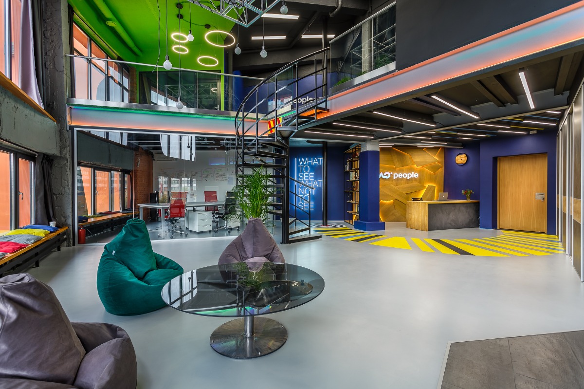 - В рабочих зонах — оупен-спейсы, кабинеты, коридоры, технические помещения.