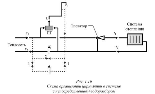 Летом система отопления не действует, поэтому вентиль 2 закрыт, а вентили 1 — открыты. Через диафрагму проходит только циркуляционный