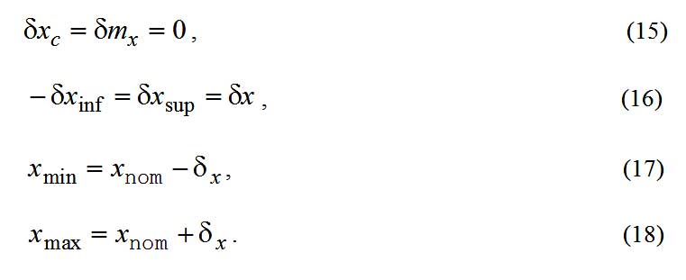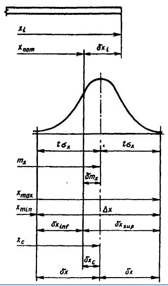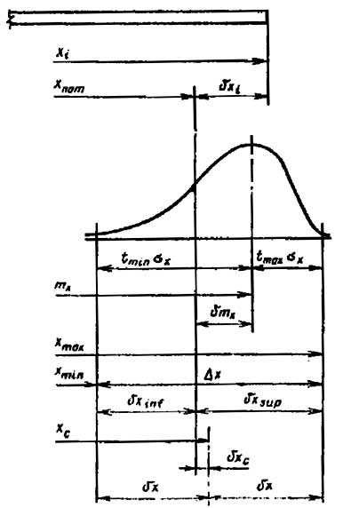 Если при этом среднее значение mx параметра практически не отличается от его номинального значения xnom, то взаимосвязь характеристик точности характеризуют формулы: