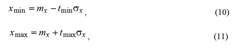 где tmin и tmax — значения стандартизованной случайной величины, зависящие от вероятности появления значений ниже xmin и выше xmax, и типа статистического распределения параметра x .