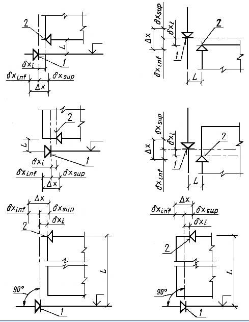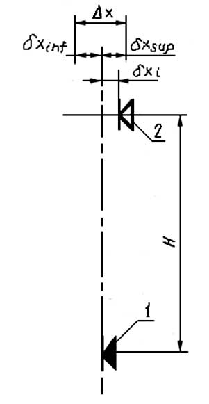 4.2. Точность установки элементов сборных зданий и сооружений характеризуют допусками совмещения и отклонениями от совмещения ориентиров (точек, линий, поверхностей) (черт. 11) и допусками симметричности и отклонениями от симметричности установки элементов (черт. 12).