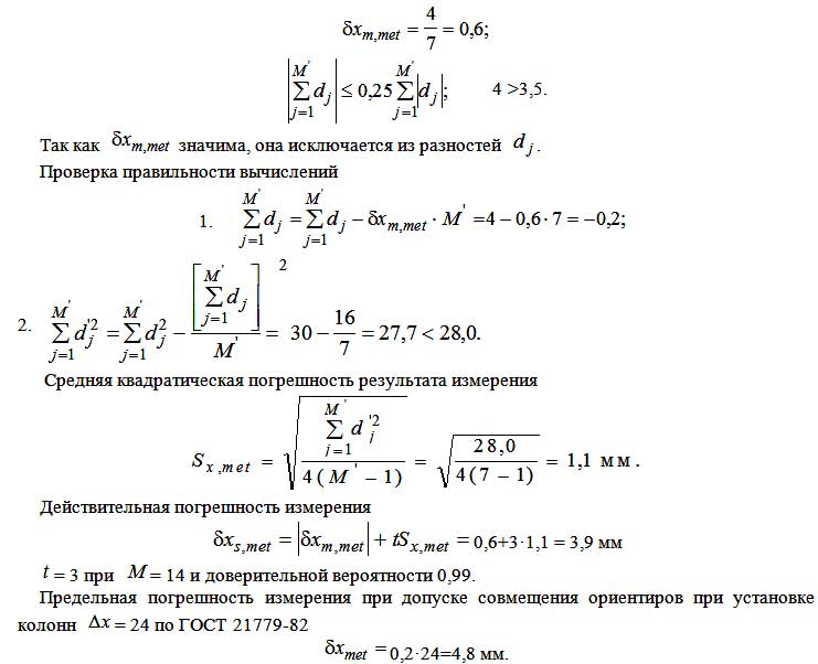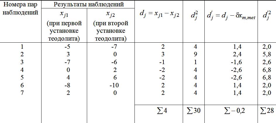 Пример. Произвести оценку точности измерений, выполненных методом бокового нивелирования двойными наблюдениями при контроле отклонений от разбивочных осей низа 7 смонтированных колонн. Произведено 7 пар наблюдений при двухкратной установке теодолита над центром пункта пространственной геодезической сети, которые являются равноточными в паре и между парами. Результаты наблюдений и последовательность их обработки приведены в табл. 4.