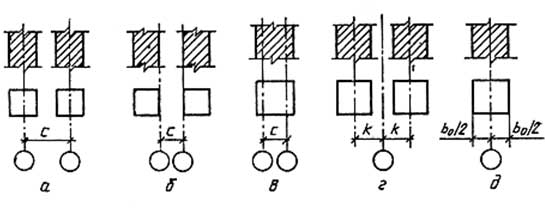 1) расстояние с между парными координационными осями (черт. 11а, б, в) должно быть кратным модулю 3М и, при необходимости, М или ½М; привязка каждой из колонн к координационным осям должна приниматься в соответствии с требованиями п. 4.7;
