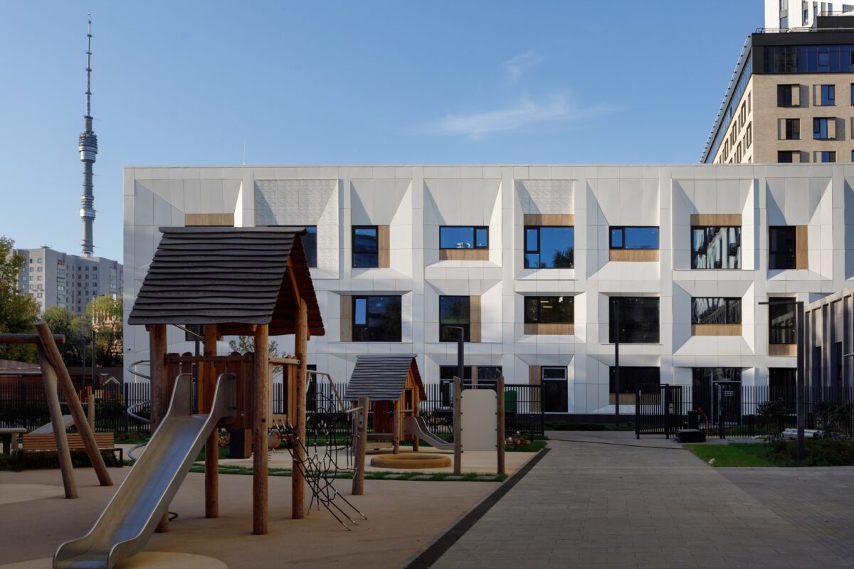 Рядом с корпусом возведено трехэтажное здание детского сада общей площадью свыше 3,5 тыс. кв. метров. Здание также выдержано в скандинавском стиле — простому объему добавляют настроения разные по размеру и геометрии окна, подчеркивающие его «детский» характер. В благоустроенном дворе площадью почти 3,3 тыс. кв. метров оборудованы игровые и детские площадки.