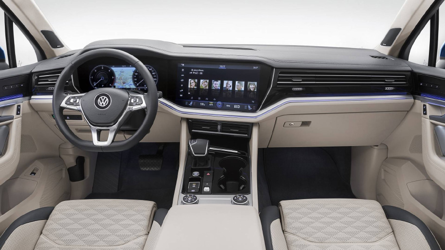 У «Туарега» полностью новый интерьер с 12-дюймовой электронной приборкой и 15-дюймовым дисплеем на центральной консоли. С него осуществляется управление большинством функций автомобиля.