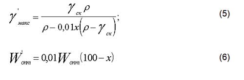 6.3. Если в грунте содержались зерна крупнее 10 мм, которые перед испытанием согласно п. 4.1.2 были удалены из пробы грунта, то для учета влияния таких зерен на величину максимальной плотности грунта необходимо полученные значения gмакс и Wопт для части пробы, прошедшей сквозь сито с отверстиями размером 10 мм, пересчитать на значения для исследуемого грунта в целом (с включением зерен крупнее 10 мм) по формулам: