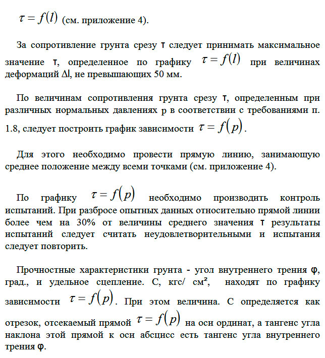 1.1. Испытания грунта на срез следует производить для определения прочностных характеристик — угла внутреннего трения φ (град.) и удельного сцепления с (кгс/см²).