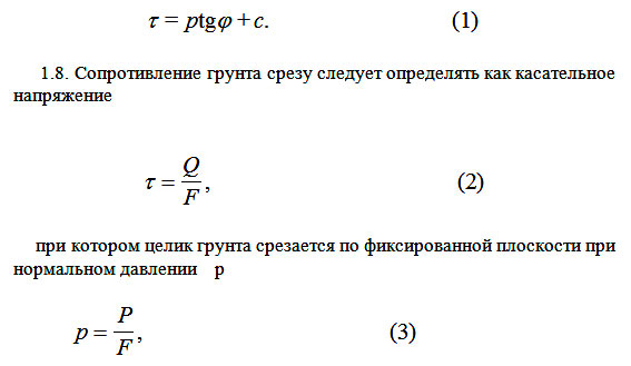 1.9. Сопротивление грунта срезу надлежит определять при испытании методом: