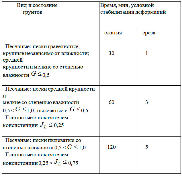 4.1.2. Каждую ступень давления ∆p при предварительном уплотнении необходимо выдерживать не менее: для крупнообломочных и песчаных грунтов — 5 мин, для глинистых грунтов — 30 мин, а конечную ступень — до условной стабилизации деформации сжатия целика грунта.