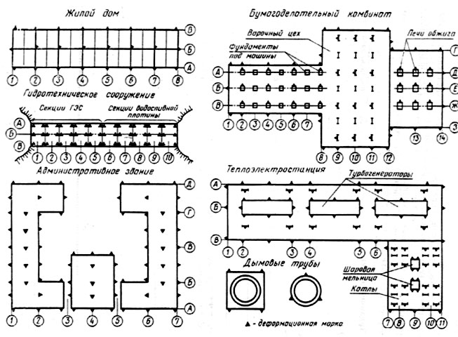 ПРИМЕРЫ РАСПОЛОЖЕНИЯ ДЕФОРМАЦИОННЫХ МАРОК НА ЗДАНИЯХ И СООРУЖЕНИЯХ