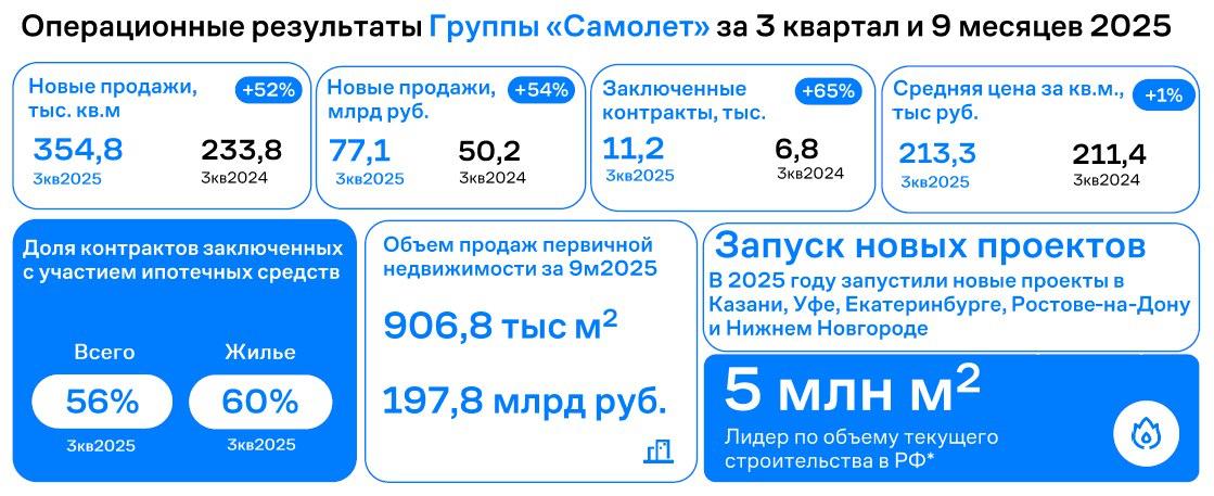 По итогам девяти месяцев 2025 года «Самолет» сохраняет лидерство среди российских застройщиков по объемам текущего строительство и занимает второе место по объемам ввода жилья[1]».