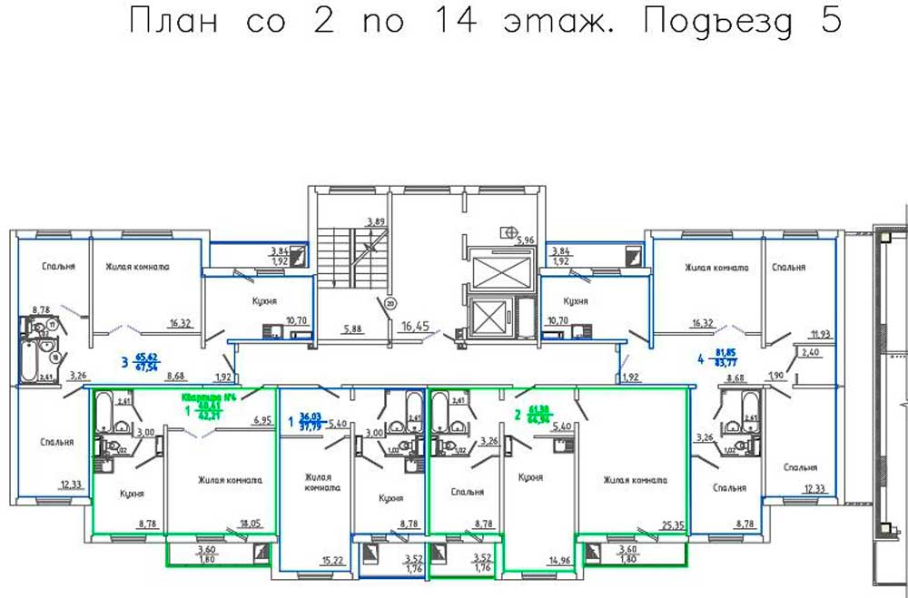 Состав квартир типового этажа 3-1-1-2-4.