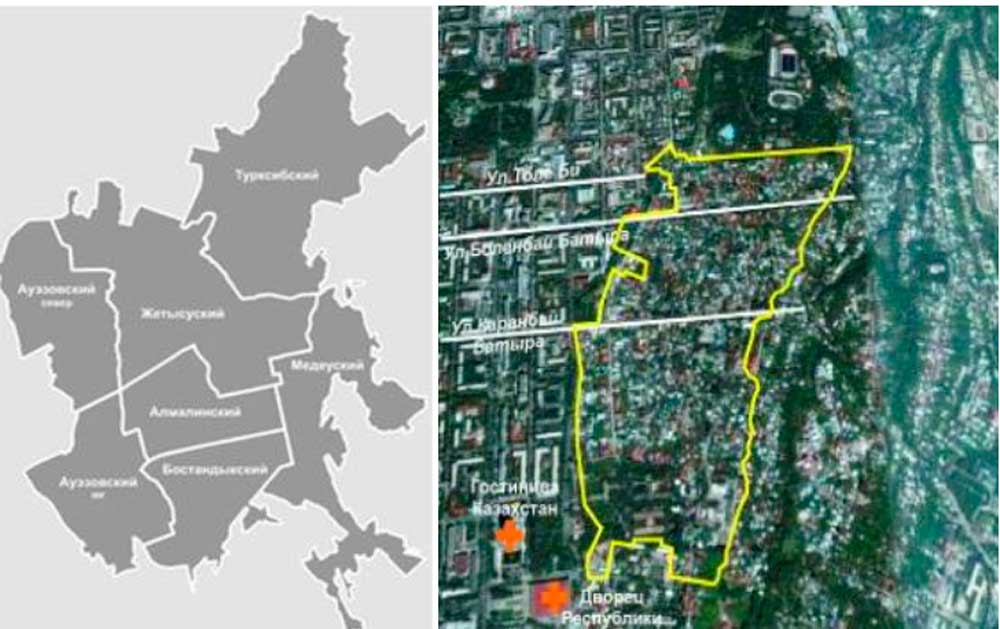 Участок расположен в Медеуском районе города Алматы, восточнее Центрального Делового района и реки Малая Алматинка, западнее реки Жарбулак, севернее ул. Байтасова.