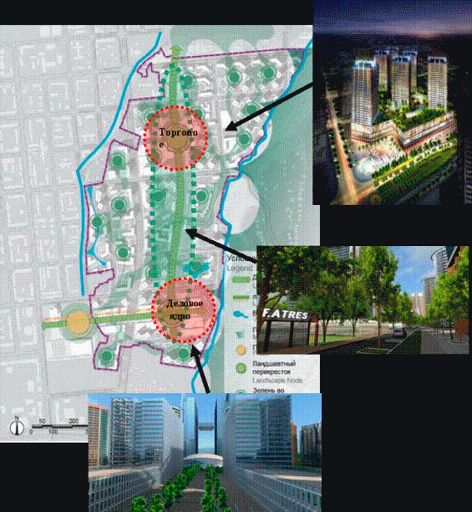 Предусмотрено создание в участке двух «ядер»: делового и торгово-развлекательного.
