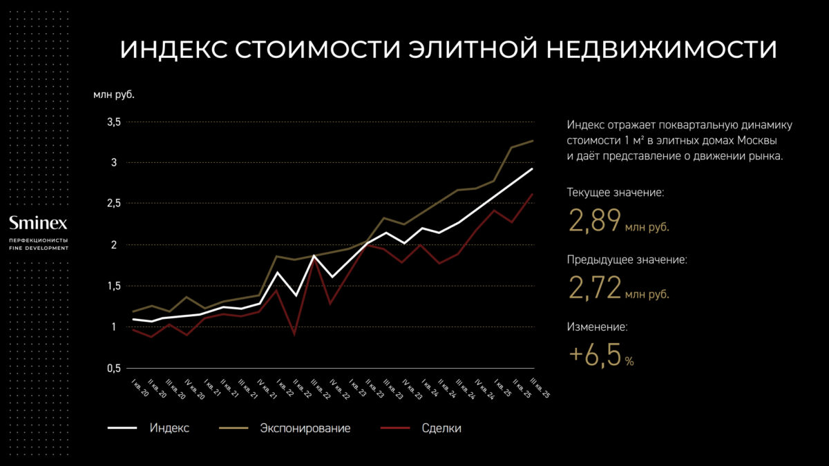 Sminex и «Финам» обновили его значение. За третий квартал он вырос на 6,5%, по сравнению с аналогичным периодом 2024 года — на 28%. При этом медианная цена в совершённых сделках увеличилась на 14%, составив 2,6 млн рублей за квадратный метр, а на витрине на 1% — до 3,22 млн рублей.