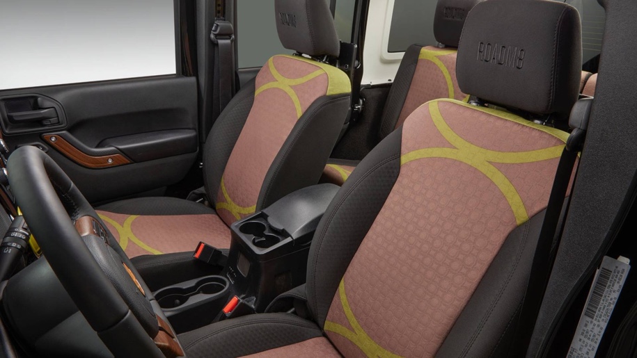 На постройку машины ушло 2,5 тысячи часов и около 100 уникальных деталей — от капота с аэрографией до специальных эмблем. В отделке салона Wrangler используется ткань и дерево, из которых выполнена мебель в номерах отелей.