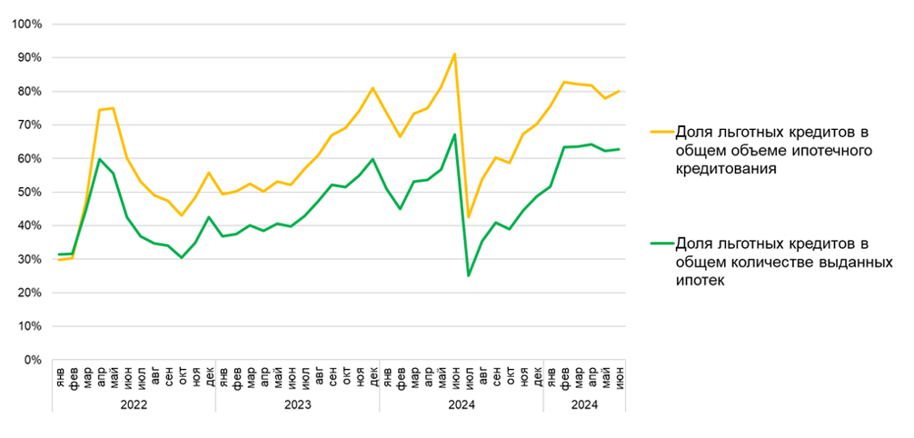 Рис. 1 — Динамика доли льготного кредитования в общем объёме ипотек в стране в 2022–2025 гг.