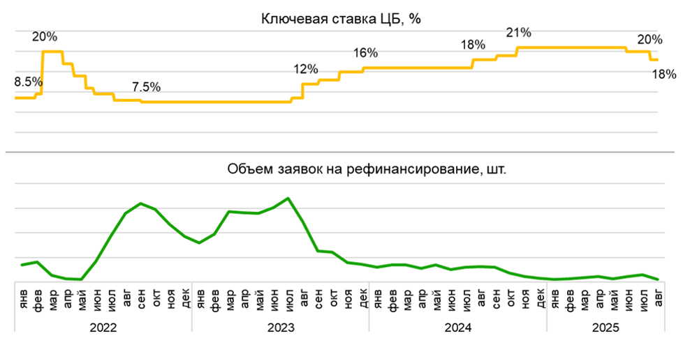 Рис. 2 — Динамика ключевой ставки в сравнении с динамикой числа заявок на рефинансирование, направленных в банки через М2 в 2022–2025 гг.