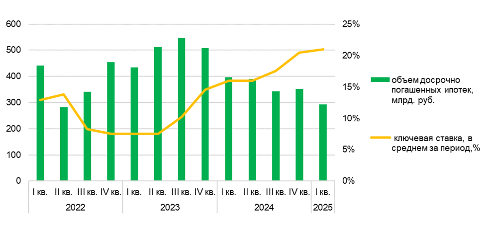 Рис. 3 — Динамика ключевой ставки ЦБ в сравнении с объёмом досрочно погашенных ипотек в 2022–2025 гг.