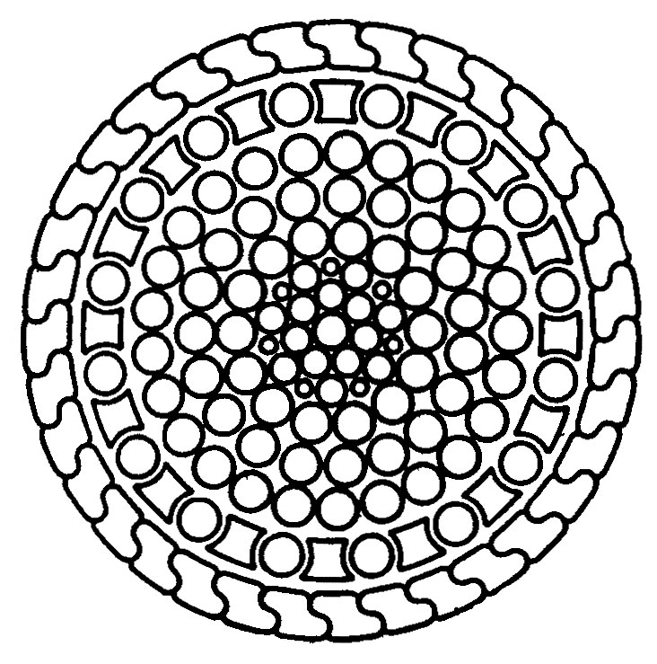 1. Настоящий стандарт распространяется на стальные закрытые подъемные спиральные канаты с одним слоем z-образных и одним, двумя или тремя слоями х-образных проволок. Канаты диаметром от 20 до 38 мм изготавливаются с одним слоем х-образных проволок (черт. 1), диаметром от 40 до 46 мм — с двумя слоями х-образных проволок (черт. 2), диаметром 50 мм — с тремя слоями х-образных проволок (черт. 3).