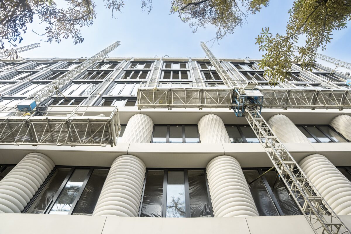 В настоящий момент в «Никитском 6» ведутся фасадные работы. Облицовка фасада клубного дома выполняется из архитектурного стеклофибробетона белого цвета, а главным элементом внешней отделки клубного дома станут колонны, созданные вручную, с оригинальным для каждого этажа орнаментом. В рисунках содержатся отсылки к облику знаковых зданий Москвы, построенных в русском стиле, – ГУМу, Историческому и Политехническому музеям