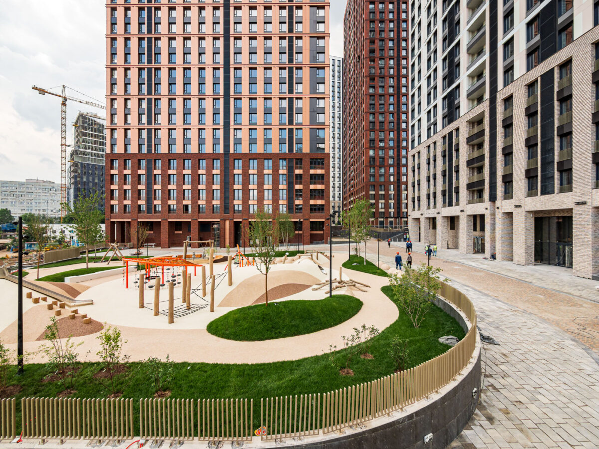 Согласно концепции благоустройства, разработанной бюро GAFA Architects, двор, вдохновленный японскими садами, вобрал в себя естественность природных линий, форм и текстур. При этом все функциональные зоны органично интегрированы в рукотворный, но приближенный к естественному, ландшафт. В центре двора разместилась большая игровая зона, работы над которой уже практически завершены.