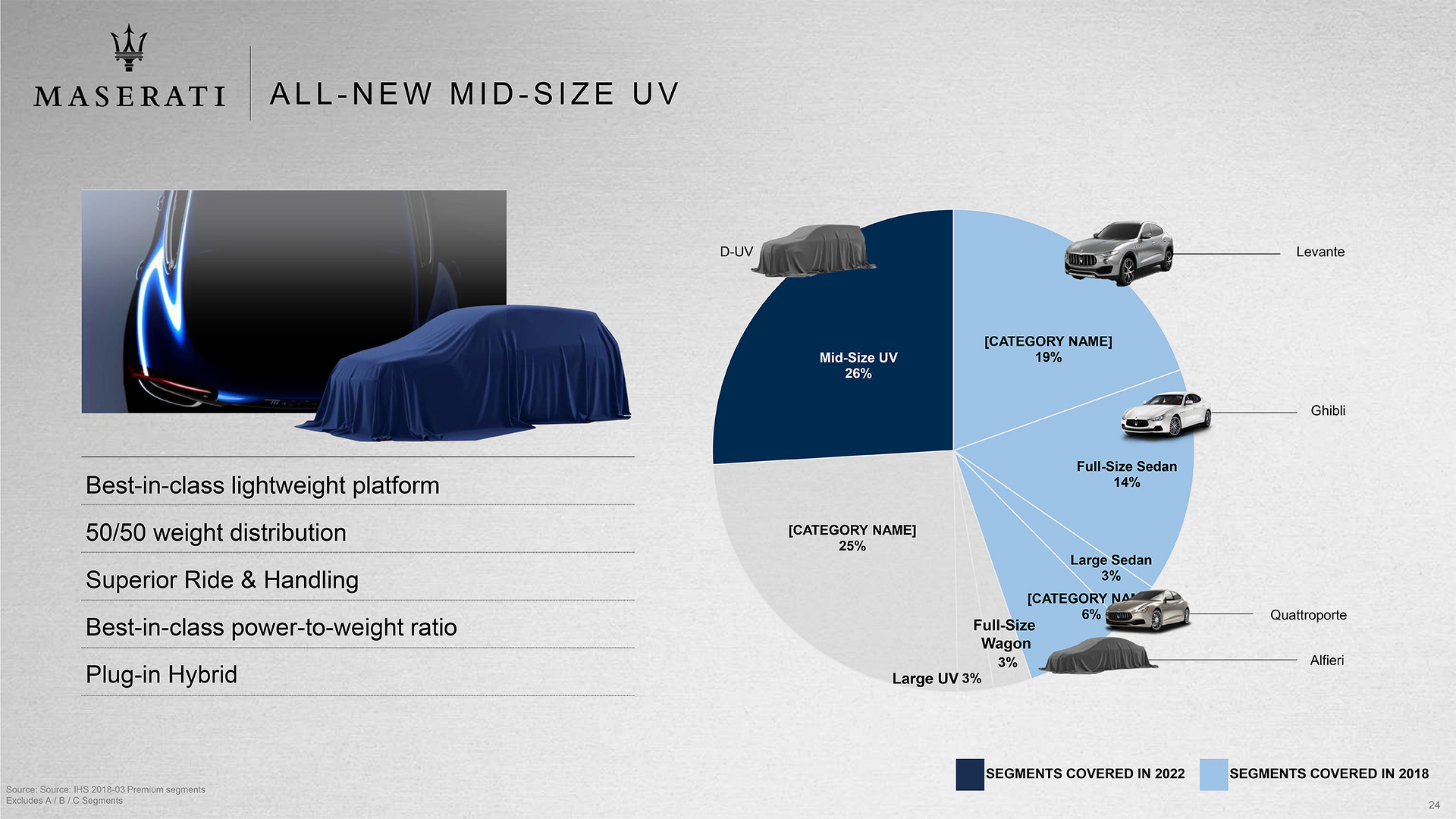 Одна из новинок Maserati – кроссовер, который по размерам будет больше Levante. Модель построят на облегченной платформе, она получит «выдающиеся характеристики управляемости и комфорта», а также идеальную развесовку по осям. Большой кроссовер предложат только в версии с гибридной силовой установкой.