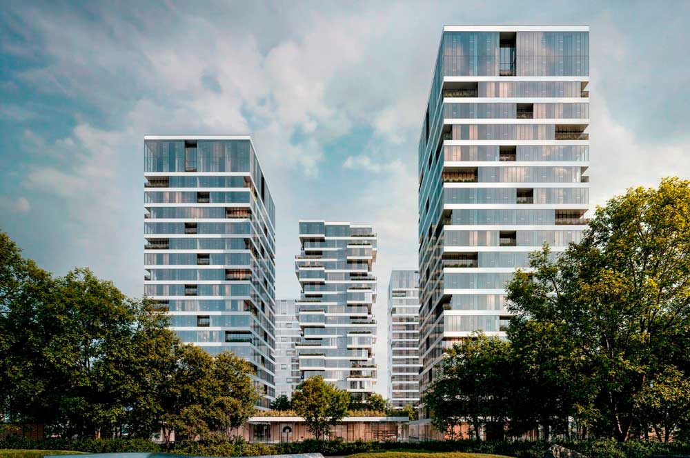 Проект состоит из пяти 18-этажных башен, спроектированных по модульному принципу с уникальным обликом каждой. Архитектурная концепция разработана бюро «Цимайло, Ляшенко и партнёры». Особенность дизайна — смещение каждого следующего этажа относительно предыдущего, что создаёт эффект «парящих» в воздухе зданий.